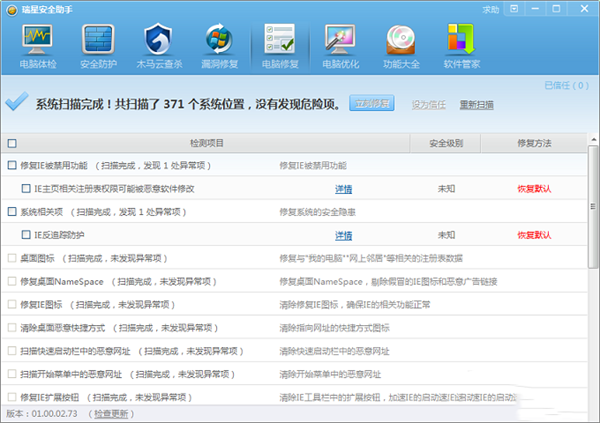 5、电脑修复修复电脑里被篡改的注册表或系统位置,恢复用户计算机原始的安全状态
