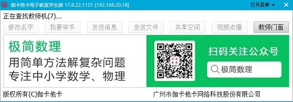 伽卡他卡电子教室学生端是一个用于在线学习和教育的应用程序,它为学生提供了方便和灵活的学习环境。学生可以通过该应用程序远程参与课堂学习,无论身处何地都能获取教育资源和课程内容。此外,学生还可以与教师和其他同学进行实时互动,包括在线讨论、提问和答疑等。应用程序还提供了丰富的在线资源,如课件、作业、习题和参考资料,方便学生自主学习和复习。学生还可以通过应用程序参加在线考试和测验,并随时了解自己的学习进度和成绩。伽卡他卡电子教室学生端的功能全面且互动性强,旨在提高学习效果和学习成果。欢迎有需要的朋友下载使用!