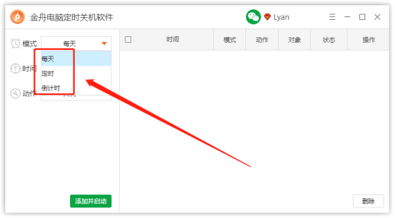 1、模式 软件提供三种模式:每天、定时以及倒计时。选择每天,可固定一个时间点循环执行此任务;选择定时,可定时选择一个时间执行任务一次;选择倒计时,可选择一个倒计时执行任务一次。