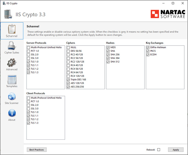 IIS Crypto官方版是一款免费简单操作的iis服务器安全管理工具,使管理员能够在Windows Server 2008、2012和2016上启用或禁用协议、密码、散列和密钥交换算法。一般的服务器安装的WEB组件就是IIS了,然则IIS本身的安全却又很难做,有了IIS Crypto就可以让你更加轻松设置IIS的安全了。它还允许您重新排序IIS提供的SSL/TLS密码套件,从而防止DROWN、logjam、FREAK、POODLE和BEAST攻击,您只需点击一下,创建自定义模板并测试您的网站,有需要的朋友欢迎下载体验。