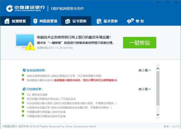 建行新版e路护航最新版本是由中国建设银行推出的一款网上交易必装网银安全组件,它能够有效的对建行证书,U盾等进行检测,以确保网银用户的财产安全,实在是建行网银用户的必备工具。除此之外,这款软件界面简洁,功能强大,包括网银安全检测工具、网银安全控件和密码保护控件等一系列安全增值服务,并且通过升级至最新版的网银盾管理工具,可进一步提升网银盾的安全性,实现“所见即所签”功能。中国建设银行e路护航网银安全组件能支持win7、Vista、XP、win8、win10等多个系统,让用户可以自由自在的修改U盾密码,不必为此跑东跑西浪费时间。利用网络技术,通过互联网向客户提供开户、销户、查询、对账、行内转账、跨行转账、信贷、网上证券、投资理财等传统服务项,使客户足不出户就能够安全、便捷地管理活期和定期存款、支票、信用卡及个人投资等。让用户可以在网上安全的进行支付功能,还能有效防范木马病毒等的侵袭。