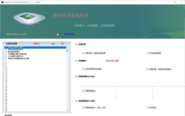 索美球类对阵比赛模式编排管理系统是一款专业级的比赛管理系统,适用于篮球比赛编排、乒乓球比赛编排、羽毛球比赛编排、网球比赛编排、足球比赛编排、排球比赛编排、 摔跤比赛编排、武术比赛编排、跆拳道等比赛项目编排与管理。索美球类对阵比赛模式编排管理系统还支持具体比赛项目的模式进行管理,可以分组别、分性别、分场地、分阶段进行比赛的编排管理,多个《比赛管理单元》可以同时管理不同项目比赛。而且索美球类对阵比赛模式编排管理系统界面简洁,操作非常简单,几乎人人都会用,欢迎有需要的朋友前来下载使用!