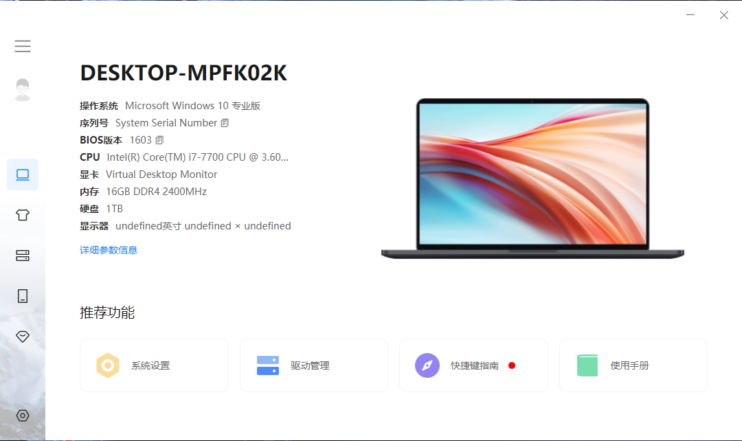 1、打开小米电脑助手,映入眼帘的是电脑的参数界面,电脑的具体参数配置就会显示在第一面,更加的直观的看清楚电脑的配置;