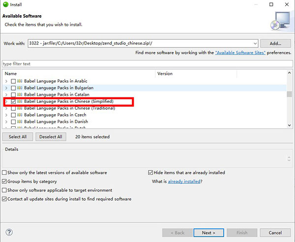 6、选择汉化包chinese.zip,然后等待2-3分钟 程序解析包文件。解析完后 就选择安装 中文简体补丁,不清楚的建议将所有简体中文的补丁都安装上