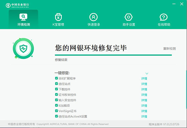 3)设置完毕后,网银助手将进行“全面检测”,您可对检测发现的问题进行“一键修复”。