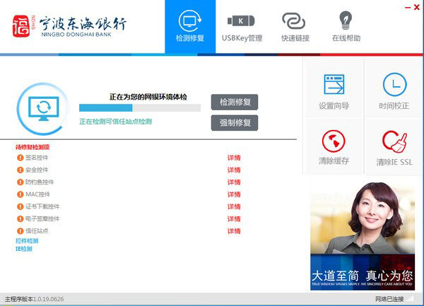 宁波东海银行网银助手是由宁波东海银行官方出品的宁波东海银行网上银行客户端的电脑端安全控件,它是一款专为网银客户制作的检测工具,软件体积小巧,在PC端安装可以帮助用户检测系统环境,如果有问题,可以一键在线修复,并提供了控件、证书等网银必备工具的下载和安装,是宁波东海银行用户的必备工具。操作简单,安装后双击打开,点击【检测修复】,完成后,点击【一键修复】即可。本站为用户提供宁波东海银行网上银行客户端新版客户端下载,正版验证,亲测有效,有需求的用户还请下载安装。