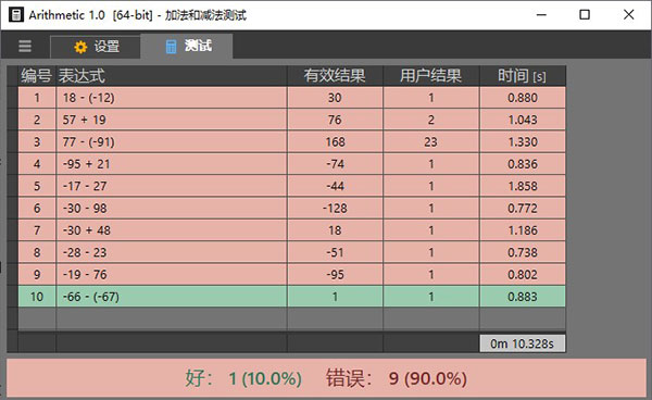 1、测试的大配置可能性:能够设置算术运算类型,数量(最多6个),每个数的最小值和最大值,算术运算的数量。2、测试完成后显示详细结果,突出显示正确(绿色)和错误(红色)结果。