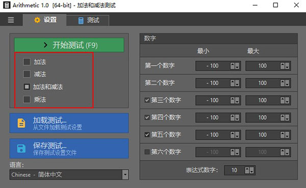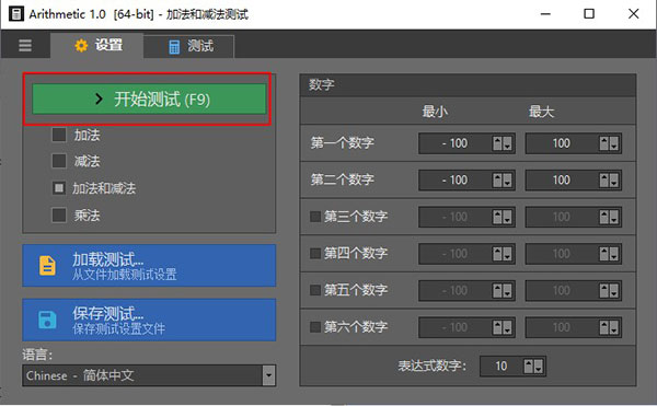 Arithmetic中文绿色版是一款数学计算学习的小工具,可用于执行算术测试的程序,包括了加法,减法和乘法。在小学学习算术基础知识,对记忆力进行快速计数的人进行练习或在执行复杂任务之前提高注意力的运动时很有用。软件支持最多六个数字的数学计算,还可以自行设置数值的大小,用来给小孩练习数学的计算非常不错。就算是大人,也可以使用它来锻炼自己的思维。软件还内置了多种测试模式,你可以从文件中快速加载测试设置。并且软件练习计算时还会画质自动计时,你可以很直观的看到你在哪里花费的时间最多,和上一次有没有进步,你甚至可以用它来比赛,看谁最快最准确!Arithmetic中文绿色版支持简体中文,并且软件无需安装,下载解压后打开即可使用,非常的方便,也没有广告什么的,完全免费。本站为用户提供了32位和64位版本,大家根据自己的电脑系统选择对应的版本解压使用即可,感兴趣的小伙伴可以下载体验!