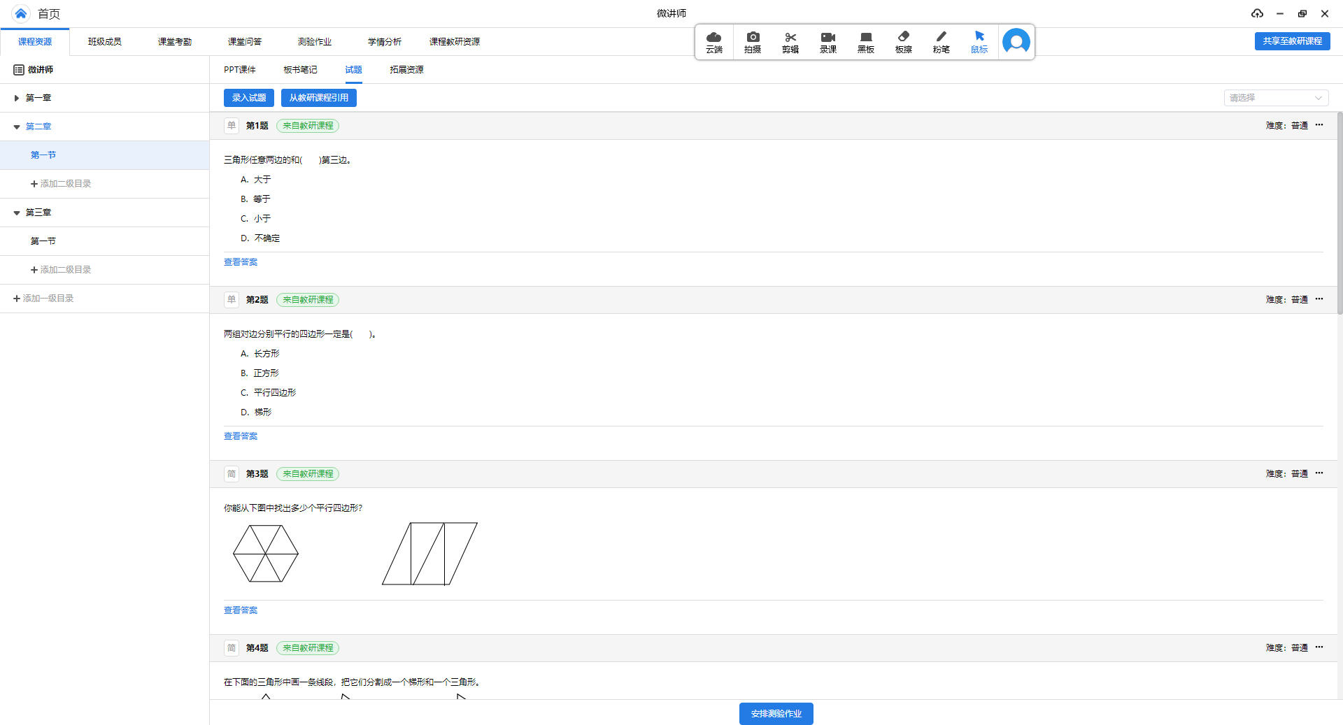 1、学情分析:在线学习、课中互动、测验作业全过程数据记录,促进教学反思改进与教学质量分析。 2、课程题库:批量录入智能识别,海量题库在线引用,线上线下灵活组卷,一键打印纸质试卷。 3、AI辅助阅卷:颠覆纸质试卷传统批阅方式,支持多人协助,节省 60%测验作业批改、上分时间。 4、在线备课:精准获取教授课程匹配的优质教学资源,一键引用、个性化编辑、节省50%备课时间。 5、教学研讨:与优秀同行开展教学研讨与学术交流,成为教研组长共享资源获取现金收益。 6、电子板书:课中实时建构,精细书写、笔迹美化、即写即现。微讲师电脑版软件如何使用