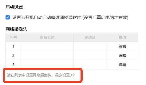 【录课没有声音】 出现这种情况通常是因为电脑有多个麦克风,录课前请检查开始界面的“声音通道”,看声音源是立体声或其他选项,选择到正确的麦克风。检查说话时声音条是否跳动再开始录课。 【支持使用教室内的监控摄像头录课吗?】 支持,软件工具条 —> “更多”—>“软件设置”中的“网络摄像头”栏目可以设置摄像头连接,最多可接入3路摄像头同时录制,但要求讲台和摄像头在同一个局域网,且知道监控摄像头的账号密码。