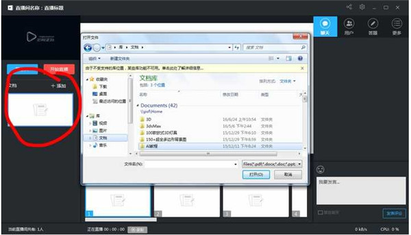 3、点击文档添加,可一边直播,一边推送相关文档。