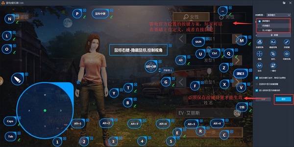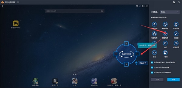 ②键盘视角(多用于3D动作游戏):拖动键盘视角按键到右半边的屏幕,默认旋转按键为↑↓←→,点击保存,也可以自行配置。