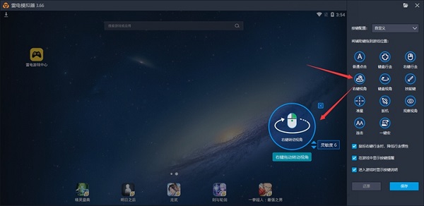 ①右键视角:拖动右键视角到屏幕,点击保存,设置好之后右键激活,可以用鼠标来控制视角转动。