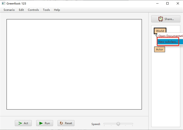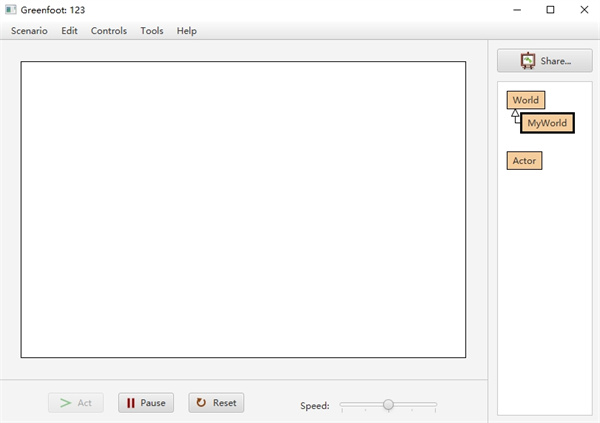 类(Class)是Java(也是所有面向对象高级语言)的核心内容。我们写程序的时候,99%的时间是在写一个个的类。可以看到在类列表中,已经有World和Actor两个类了,它们俩是Greenfoot最为核心的两个类,这在之后会慢慢介绍。除了这两个已有的类之外,我们之后所写的每一个类,都会出现在类列表中。类之间有相互继承的关系(之后介绍),这层关系在Greenfoot中将会被类列表清晰地体现出来。