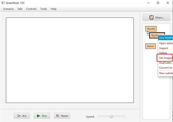 4、为了实现这些功能,Greenfoot框架提供了一个Actor基类,其他任何想实现可视化的类都要继承他,必须执行的两个最重要的方法是:getImage()返回对象的图形,act()将在模拟路线中调用。
