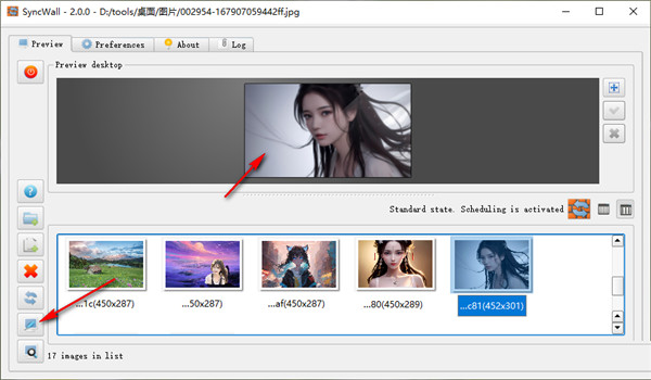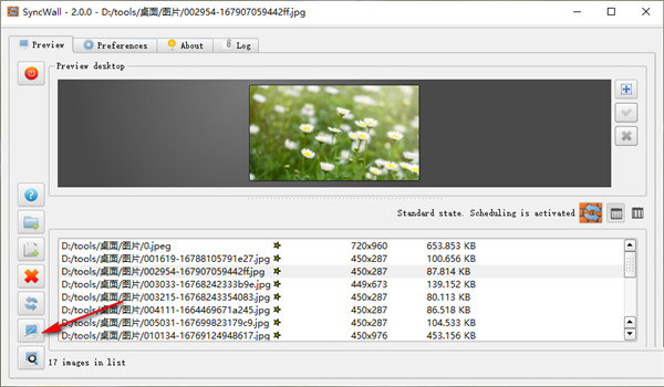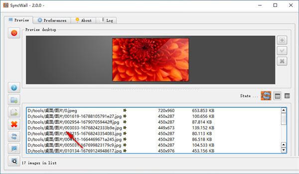 2、能够添加多个图片文件夹,添加之后,SyncWall界面中带有多种显示方式,你可以使用缩略图模式查看和管理所有已添加的图片,这个模式会告诉你所有图片的尺寸,如果觉得缩略图还是太小的话,使用预览按钮可以查看100%大小的大图。