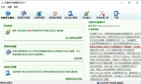 恶意软件清理助手官方版是一款专业的反恶意入侵杀毒软件,不仅拥有十分多广泛的电脑安全检测服务,还提供了恶意软件、进程服务、系统文件、自动运行以及注册表清理工具等,让您从源头轻松控制和拒绝恶意软件。软件使用非常方便,无需安装,双击即可运行。另外。恶意软件清理助手完全兼容win 10、win 7等主流操作系统,全新的清理引擎和超快的病毒扫描速度,让查杀恶意软件消失的更快。需要的朋友一定不要错过,赶紧下载使用吧!