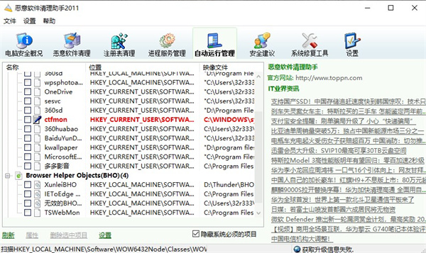 3、注册表清理主要是针对很多恶意软件对注册表的一些破坏进行修复。