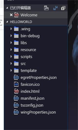 新建HelloWorld项目,用Egret Wing打开项目,结构为