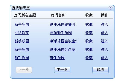 点击“确定”按钮,系统将会自动为您查找符合条件的房间,点击其房间所在主题可以在大厅页面部分显示该区房间列表;点击“收藏”可以将该房间添加到收藏列表中;点击“进入”即可直接进入该房间。