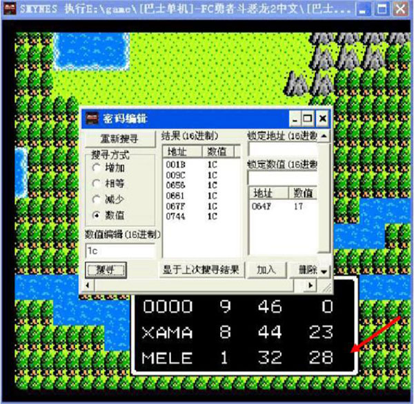 5、按Q打开密码编辑,搜寻方式选数值,搜现在数值等于28的地址有多少,需要注意的是进制为16位的,因此需先用进制转换成16进制1c。