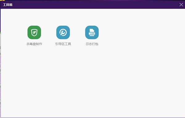 6、还有工具箱,里面有三个实用工具:杀毒盘制作、引导区工具、日志打包。都是非常实用的。