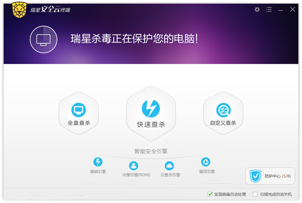 1、同时使用基础引擎、决策引擎、云查杀引擎、基因引擎,与瑞星云端相连享瑞星上亿病毒库资源,精准高效。
