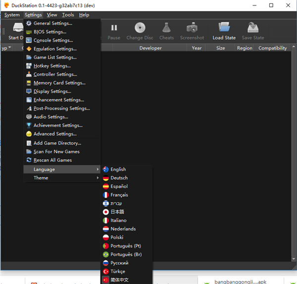 点击 duckstation-qt-x64-ReleaseLTCG.exe 文件即可运行模拟器,在Settings ->Language 中选择简体中文,然后重启模拟器即可进入中文界面。点击设置按钮进入设置界面。