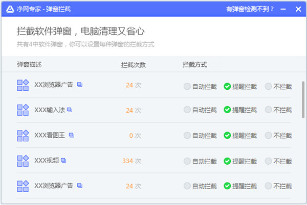 a) 当有弹窗的时候,我们的净网专家会弹出浮条来提示你“是否需要拦截”?