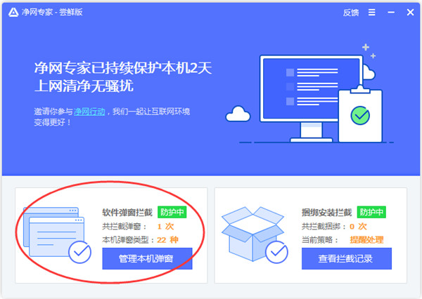 1. 只要成功安装净网专家,捆绑软件拦截就会自动生效,实时监控软件安装的一举一动。