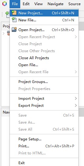 2、进入主界面后,先花点时间浏览一下界面布局。界面是英文的。最上面一行是导航栏。我们需要点击左上角的“File”,然后再点击“New Project…”,然后会出现一个新工程向导界面。