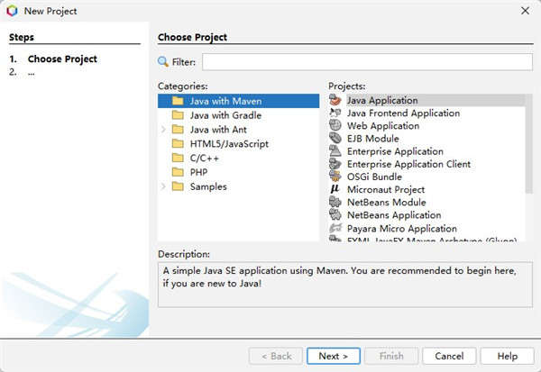 3、来到“New Project”向导界面后,左侧的“Steps”表明当前正处于工程类型选择状态,我们可以用NetBeans创建各种类型的工程。我们会使用Maven工具来构建Java工程,然后点击“Next”按钮。