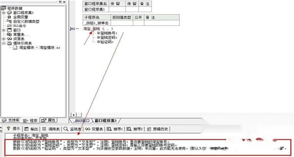 4、在子程序中 添加一条模块中的命令,如:“淘宝_登陆”(注意,只有加载这个模块后,命令才起作用),输入后可以展开所看到的,下面的状态栏还可以看到下面有说明提示。