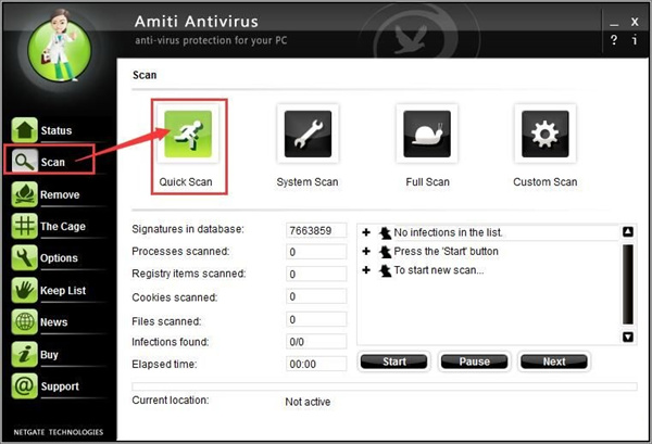 打开Amiti Antivirus软件点击软主界面左边功能栏中的Scan扫描,打开扫描功能窗口。我们可以选择快速扫描、系统扫描、完全扫描和自定义扫描。点击快扫描,开始扫描电脑病毒;
