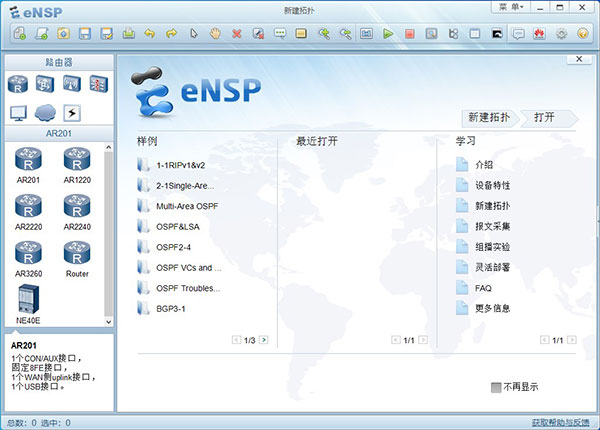 1、图形化操作 eNSP提供便捷的图形化操作界面,让复杂的组网操作变得更简单,可以直观感受设备形态,并且支持一键获取帮助和在华为网站查询设备资料。 2、高仿真度 按照真实设备支持特性情况进行模拟,模拟的设备形态多,支持功能全面,模拟程度高。 3、可与真实设备对接 支持与真实网卡的绑定,实现模拟设备与真实设备的对接,组网更灵活。 4、分布式部署 eNSP不仅支持单机部署,同时还支持Server端分布式部署在多台服务器上。分布式部署环境下能够支持更多设备组成复杂的大型网络。华为eNSP模拟器完整版安装教程