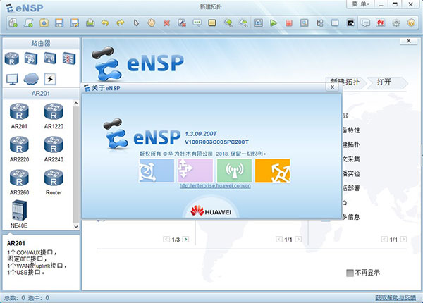新增功能: 1、集成了最新版本的USG6000V设备(V500R005C10SPC300)(默认用户名:admin,密码:Admin@123)。 BUG修复: 1、修复SVRP设备只能开启16台问题。 2、修复SVRP设备连线最多只能连接20条问题。 3、更改了NE40E和CE12800的界面摆放位置,将NE40E归于路由器类,CE12800归于交换机类。