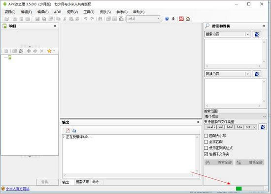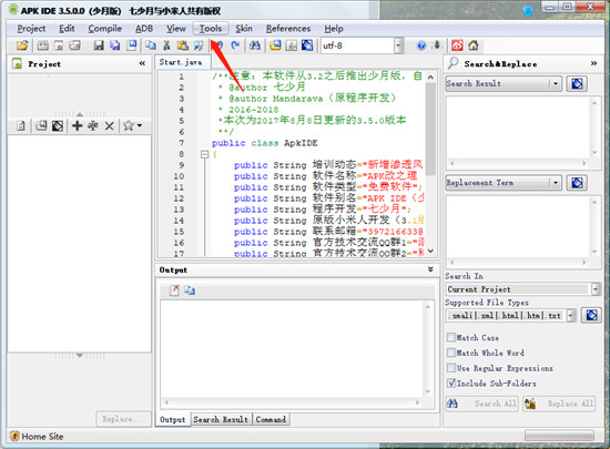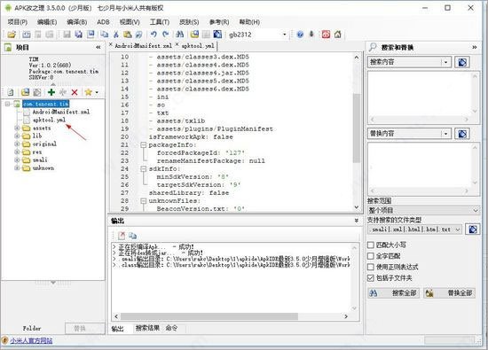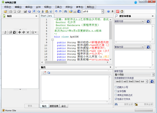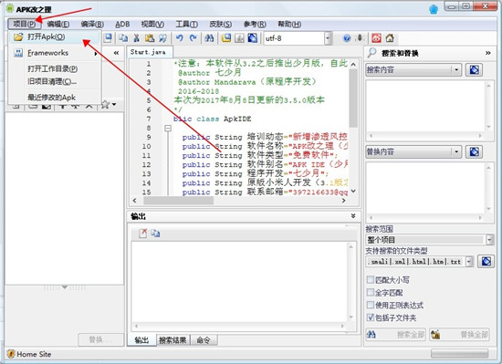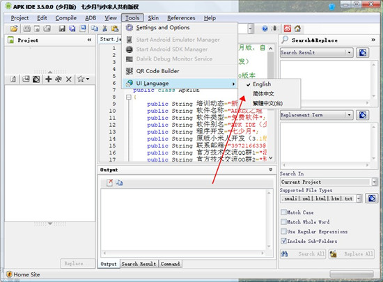 4、内置基于文件内容的关键字或多行代码段的搜索、替换引擎,一键搜索替换,搜索结果以标签的形式分门别类;允许在指定搜索范围(整个工程或选中的文件或文件夹内搜索),支持正则表达式搜索和替换。搜索功能是Apk修改的一个重要工具,从此你不必借助其它第三方搜索工具。