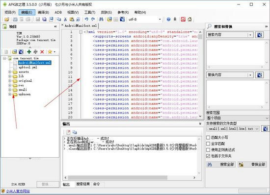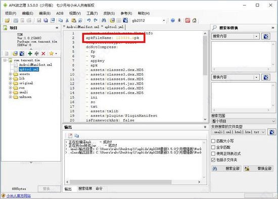 修改完成后单击菜单[编译]-[编译生成Apk]重新将源代码打包成apk文件,新生成的apk存放在原apk的同级目录下,其名称以“ApkIDE_”开头。