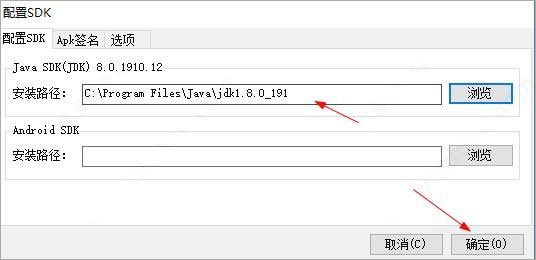 2、在搭建好java环境之后,直接打开APK改之理,系统会自动弹出要求你进行配置,这里你只要输入你搭建java环境的安装路径即可,点击【确定】,就可以完成配置,至于下面的【Android SDK安装路径】,根本不需要理会,空着就好。