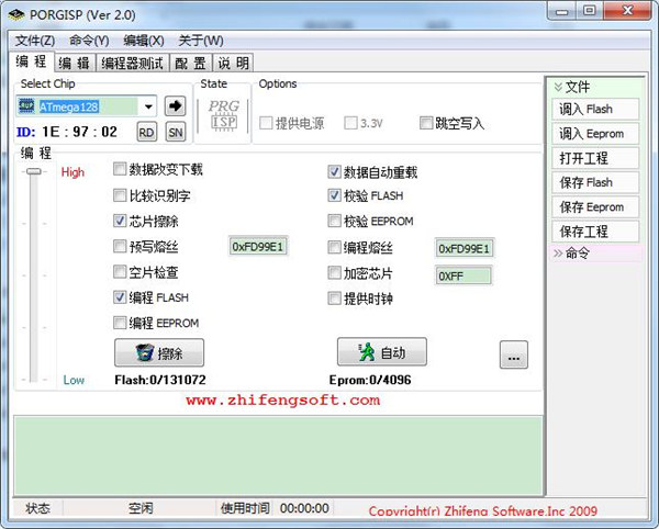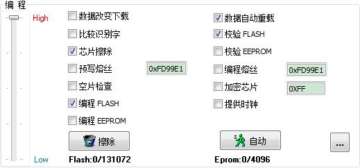 勾选“编程栏”相应的编程选项,点击“自动”可以完成编程。如果出错会有对话框弹出进行提示。如果写入成功,信息提示栏会显示出相应成功的信息。也可以点击“擦除”擦除芯片。