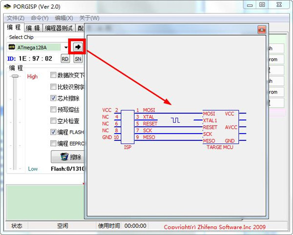 2、点击“黑色的箭头”可以弹出下载器与你的目标cpu的提示接线图或cpu在编程座上的摆放位置图,如果是isp下载线是10pin下载线接口与目标cpu的连线示意图。