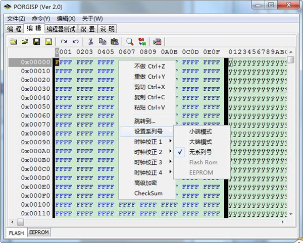 在数据缓冲区栏选择放置系列号的地址点击鼠标右键弹出菜单,选择大端或小端模式输入系列号。如果数据缓冲区在flash状态,系列号就放在flash,否则放在eeprom