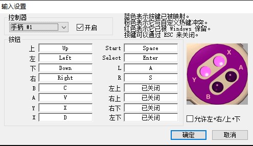 游戏手柄1的默认键映射如下: 向上箭头 向上方向 向下箭头 向下方向 左箭头 左方向 右箭头 右方向 V A按钮 C B按钮 D X按钮 X Y按钮 A L按钮 S R按钮 回车 选择按钮 空格 开始按钮