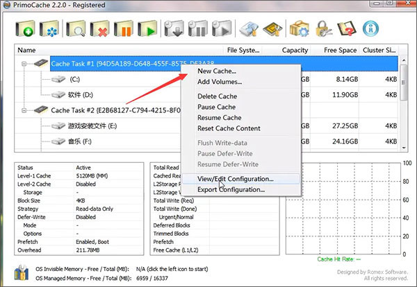 此外,primocache硬盘优化软件还提供了Write-Through和Write-Back缓存模式、磁盘碎片整理和缓存自定义选项等特性。对于经历大量磁盘活动的系统,例如游戏pc、媒体编辑工作站和数据库服务器,它可能特别有用。