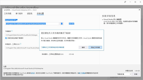 8、出现一个系统提示,点击“继续”或“添加工作负载”都可。