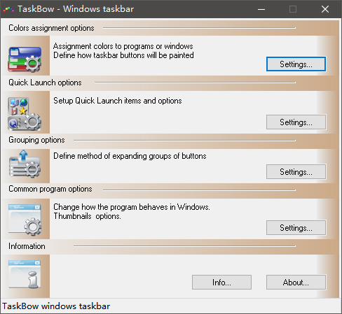 1、能设置window任务栏的样式颜色,排列。 2、可以添加需要更改颜色的程序,以及颜色。 3、在鼠标经过时是自动弹出。 4、可以设置每行显示数。 5、包括xp和windows 7,windows10等,带有相似按钮分组功能和新的快速启动栏。 6、功能强大,操作简单快捷。TaskBow的使用