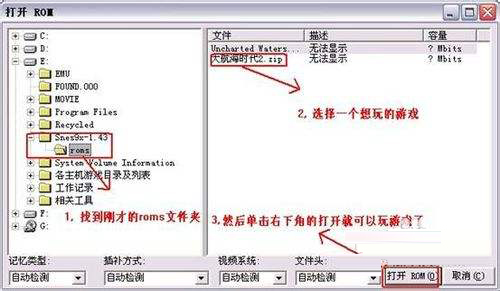 4、 找到刚才的roms文件夹、选择一个想玩的游戏、比如:大航海时代、然后单机右下角的打开就可以玩游戏了