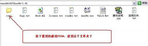 1、 将下载到的模拟器解压缩、你会看到一个roms文件夹、这里就是存放游戏ROM文件的。如图: