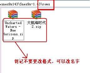 2、 将下载到的SFC游戏ROM、放到上面说的roms文件夹下、注意、ROM是ZIP格式、你可以改变ROM的名字、但是不要解压缩也不要改后缀名、比如下载《大航海时代2》得到的文件是 Uncharted Waters - New Horizons.zip、为了方便记忆你可以改成 大航海时代.zip。如图: