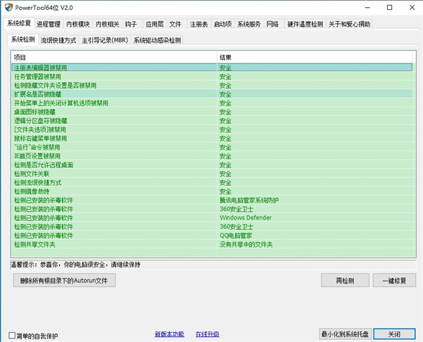 Powertool可检测计算机的相关项目是否被感染和禁用,可查看注册表编辑器、任务管理器、鼠标右键菜单和IE首页设置等是否被禁用,同时可查看扩展名是否被隐藏,镜像是否被劫持和杀毒软件是否安全等问题